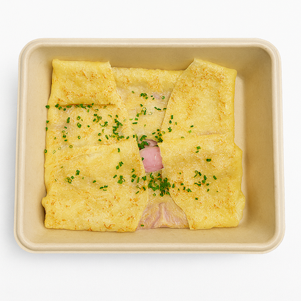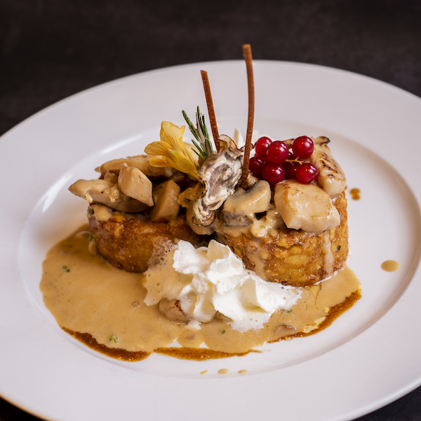 Rösti vol-au-vent, thinly sliced chicken, mushroom sauce