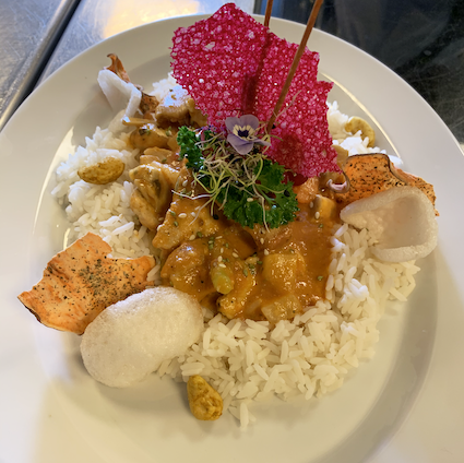 Red Thai curry, coconut, vegetables, rice, cashew nuts