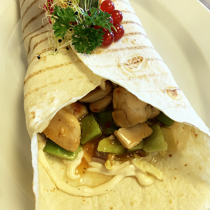 filled with sliced chicken, avocado, lettuce, tomatoes, cumcumber, oignons, garlic chili sauce