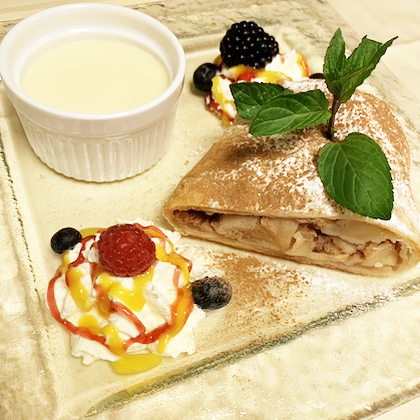 Warm apple strudel, vanilla sauce, whipped cream