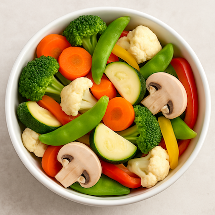 Broccoli, carrots, cauliflower, zucchini, sugar pea, pepper, mushrooms