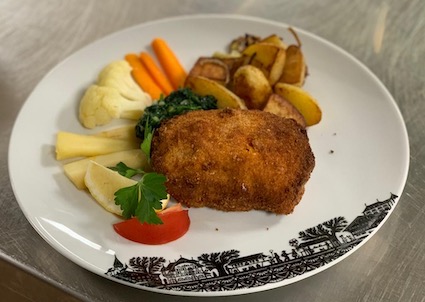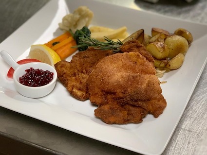 Breaded veal escalope stuffed with farmer’s ham and our blend of cheeses, served with vegetables and french fries