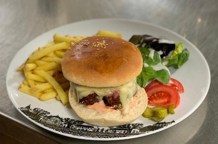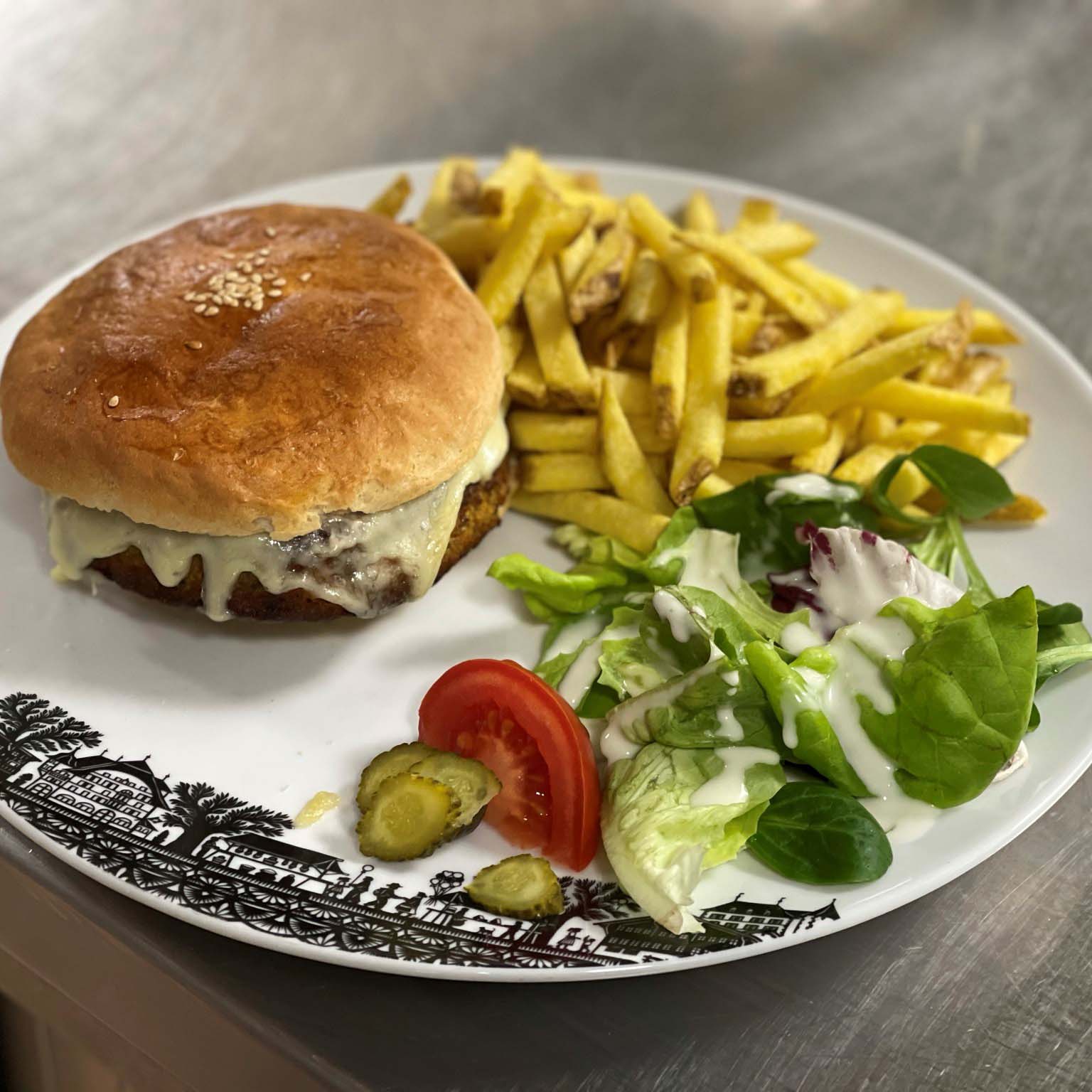 made with vegetables, oat flakes and chickpeas with tomatoes and onions, gratinated with Schönrieder Raclette cheese, accompanied by French fries and salad