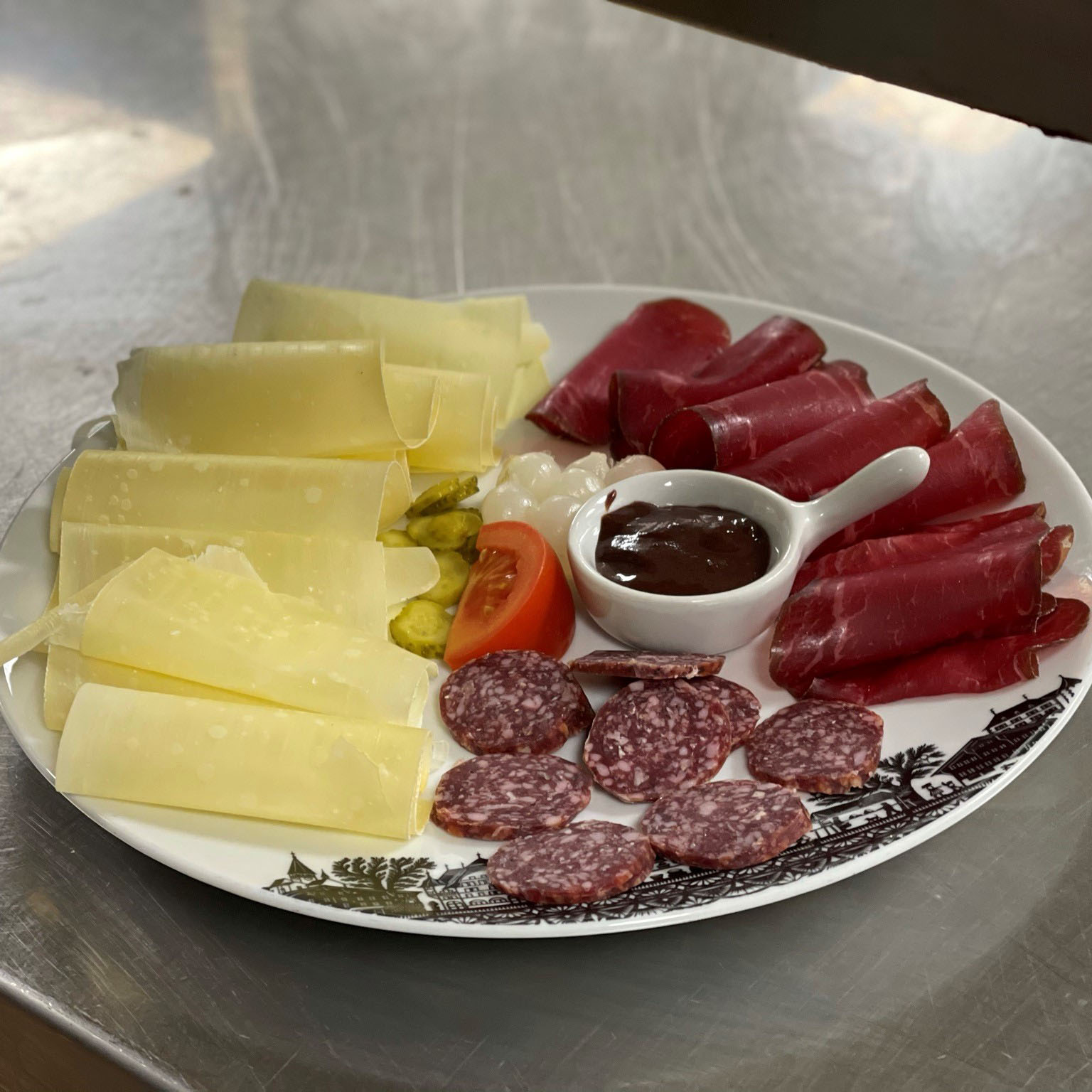 Air dried meat from Gstaad, shavings of mountain-cheese, smoked sausages and a Saanen mustard dip