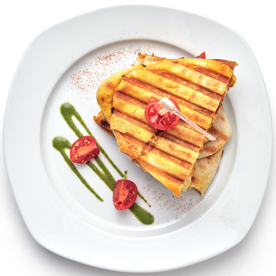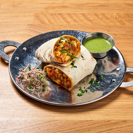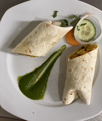 Wrap filled with soft cheese “indian style”, pepperoni vegetables, served with green chutney