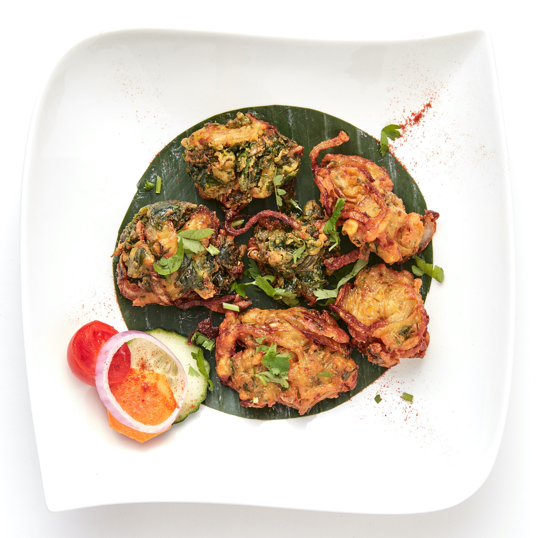 Indian pakora made from spinach and onions, baked in chickpea flour, served with tamarind and green chutney