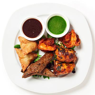 Samosa, prawn pepper masala, chicken tikka, lamb kebab served with tamarind and green chutney