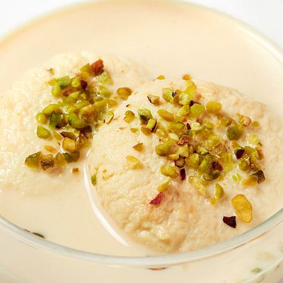 Creamy sweet spongy balls served in a cardamom cream (gluten-free)