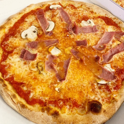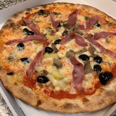 Tomatoes, mozzarella, mushrooms, baked ham, artichoke, olives