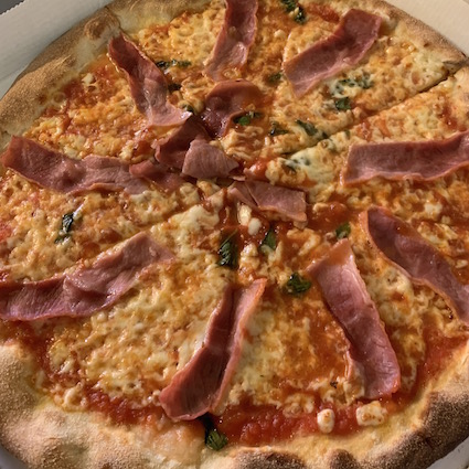 Mozarella, tomato sauce, ham, basil