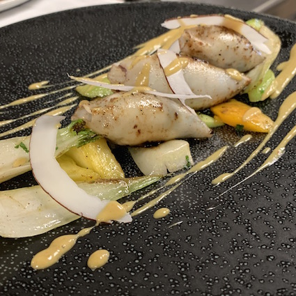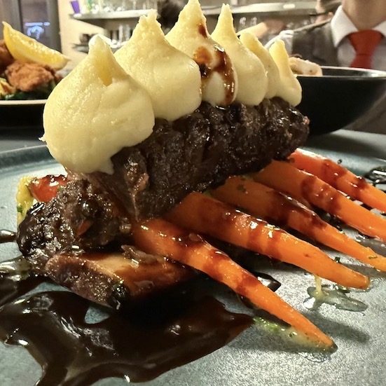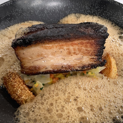 pork belly 36 hours slowly cooked, mixed summer vegetables, potatoes with smoked spices