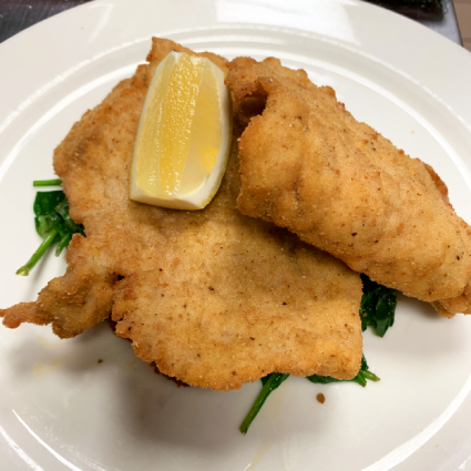 Viennese style veal escalope, mashed potatoes, spinach with olives and dried tomatoes