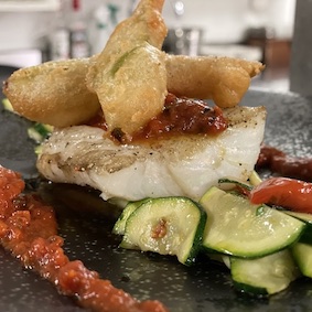 Codfish pan-seared, parmigiana style and foam of tomato basil