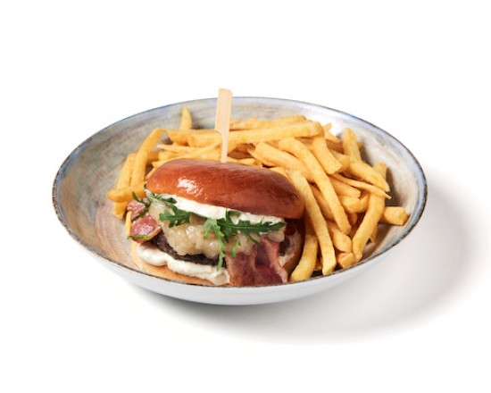 Beef, raclette cheese, black truffle mayo and bacon.