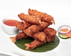 Crispy prawn tempura, served with a sweet and spicy chili sauce, ideal as a light and tasty appetizer.