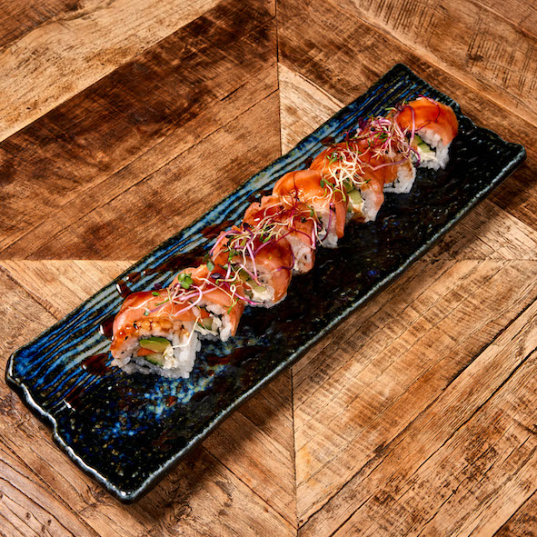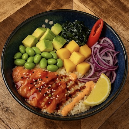Smoked salmon with avocado, edamame, red onion, wakame seaweed, mango and sesame over sushi rice, finished with a light soy-sesame drizzle, spicy mayo and Teriyaki sauce.