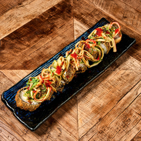 Tempura roll with Philadelphia, cucumber and avocado, topped with crab salad (8 pcs)