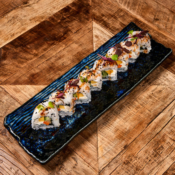 Vegetarian roll with mango, avocado, cucumber and carrot, garnished with sesame seeds, teriyaki sauce and micro-mesclun (8 pcs)