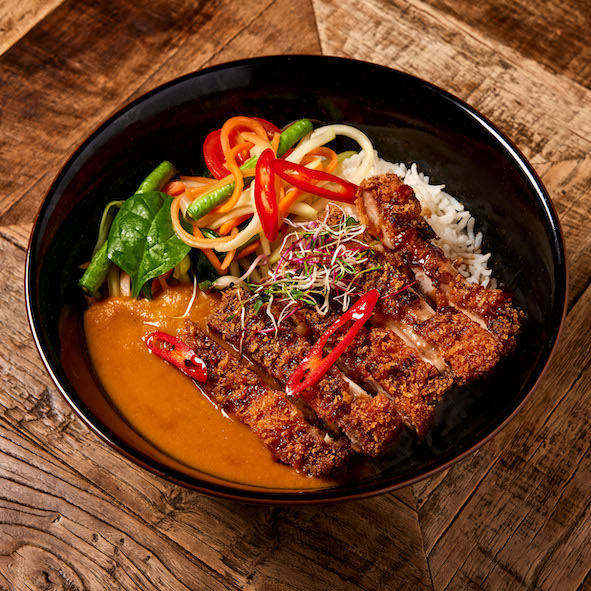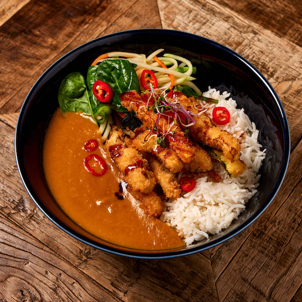 Crispy Korean-style chicken katsu with Thai curry sauce and basmati rice