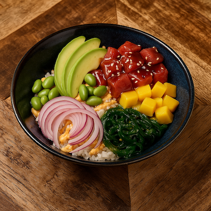 Tuna with avocado, edamame, red onion, wakame seaweed, mango and sesame over sushi rice, finished with spicy mayo and Teriyaki sauce.